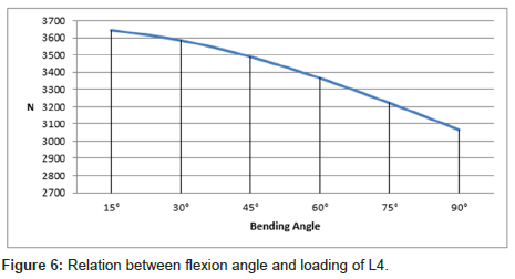Figure 6 shows the stress in L4 under different lumbar flexion angles for a person weighing 60 kg and lifting a 20 kg object. We conclude that the stress in L4 decreases non-linearly with an increase in the flexion angle. The larger the flexion angle, the smaller the stress in L4. Figure 7 and 8 show the relationship between stress in L4 with a 15° flexion angle for different object weights (body weight is 60 kg) and different body weights (object weight is 20 kg), respectively. Due to the linear increase in weight, the stress in L4 also increases linearly in both figure 8. These results are reasonable as sown in Figures 6-8.