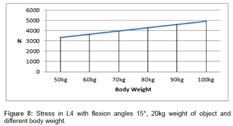 Figure 8: Stress in L4 with flexion angles 15°, 20kg weight of object and different body weight.