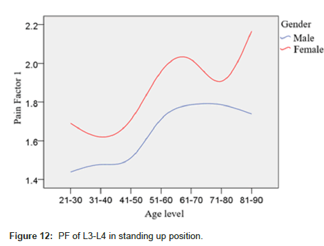 Tables 4 and 5 show the pain factor distribution due to L3-L4 and L4-L5 intervertebral discs with age and gender for different positions, i.e., PF 1 for standing up and PF 2 for a 15° angle of flexion. In general, the PF of the male sub-Groups (GM) is less than the PF of the female sub-Groups (GF), as shown in Tables 4 and 5. This can also be easily seen from (Figures 12-15).