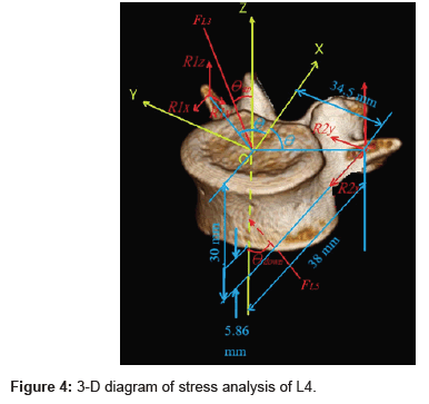 The longitudinal stress is easily calculated from the equation above. This pressure acts when the disc protrudes, causing abnormal stretching and then swelling and inflammation of the muscle. So far, we have considered only the stress from L3 to L4. Figure 4 is a 3D diagram for stress analysis in L4. Stress from L5 will also be analyzed.