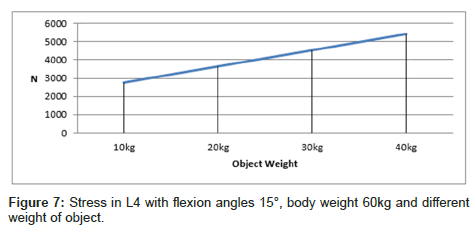 Figure 7: Stress in L4 with flexion angles 15°, body weight 60kg and different weight of object.