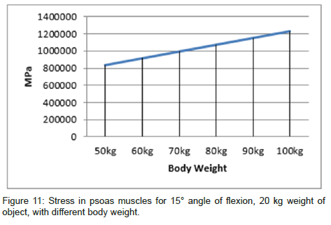 Figure 11: Stress in psoas muscles for 15° angle of flexion, 20 kg weight of object, with different body weight.