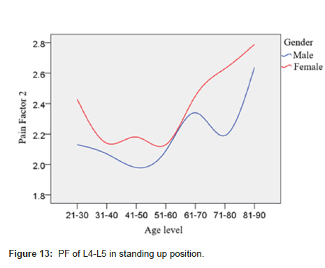 Tables 4 and 5 show the pain factor distribution due to L3-L4 and L4-L5 intervertebral discs with age and gender for different positions, i.e., PF 1 for standing up and PF 2 for a 15° angle of flexion. In general, the PF of the male sub-Groups (GM) is less than the PF of the female sub-Groups (GF), as shown in Tables 4 and 5. This can also be easily seen from (Figures 12-15).