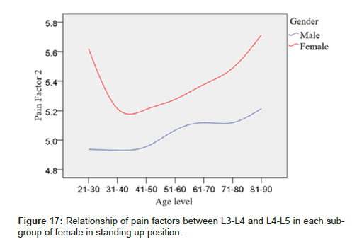 Figure 17: Relationship of pain factors between L3-L4 and L4-L5 in each subgroup of female in standing up position.
