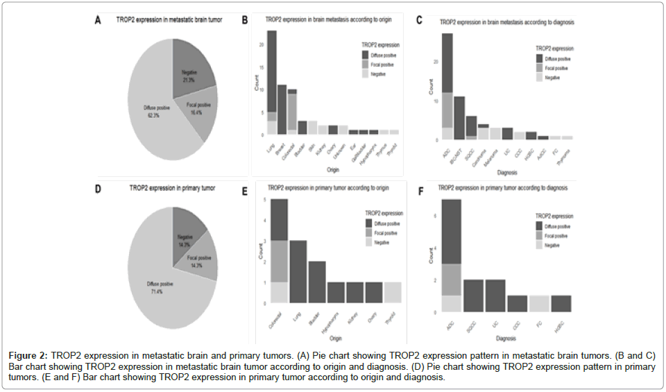 Figure 2: TROP2 expression in metastatic brain and primary tumors. (A) Pie chart showing TROP2 expression pattern in metastatic brain tumors. (B and C) Bar chart showing TROP2 expression in metastatic brain tumor according to origin and diagnosis. (D) Pie chart showing TROP2 expression pattern in primary tumors. (E and F) Bar chart showing TROP2 expression in primary tumor according to origin and diagnosis.
