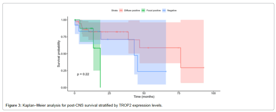 positivity. No significant association was found between TROP2 expression levels and post-CNS metastasis survival. In the paired analysis of 14 cases with both primary and metastatic tumors, TROP2 expression was consistent between primary and metastatic sites in 78.6% of cases. However, 21.4% of cases, including colorectal adenocarcinoma and kidney clear cell carcinoma, showed discordant expression patterns between the primary and metastatic lesions.